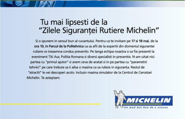 « Zilele Siguranţei Rutiere Michelin » au debutat pe 15 şi 16 mai la Floreşti (Prahova) şi vor continua în Bucureşti pe 17 şi 18 mai în parcul de la Politehnică şi pe 19 şi 20 mai în parcul Herăstrau (intrarea cu Pavilionul H). Evenimentul este deschis publicului larg, care va avea oportunitatea să se implice în toate activităţile de siguranţă rutieră organizate în fiecare spaţiu şi să interacţioneze cu experţi în siguranţă rutieră precum pilotul de raliu Titi Aur, reprezentanţi ai Poliţiei Rutiere sau specialişti din zona medicală.