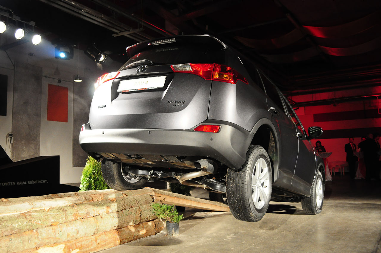Joi, 14 martie, cea de-a patra generatie a modelului RAV4 s-a prezentat oficial in fata publicului roman. Intr-o locatie inedita indoor, trei modele RAV4 ne-au acaparat imediat atentia prin prezenta lor impunatoare. Dar doua dintre cele trei modele nu au avut rabdare sa stea cuminti in fata bliturilor si s-au pus pe treaba sa ne demonstreze de ce sunt cu adevarat capabile. Neinfricat, asemenea unui acrobat care executa echilibristica pe o sarma intinsa, RAV4 a parcurs traseul de off-road, cel mai spectaculos moment al programului artistic fiind obstacolul pentru punti incrucisate.