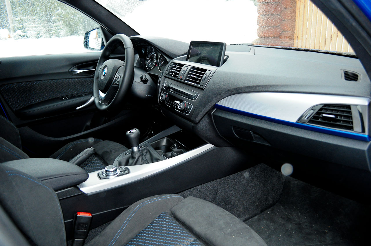Revenind la masina noastra, xDrive foloseste un ambreiaj umed multi-disc, spre deosebire de quattro si al sau diferential Torsen. In conditii normale, xDrive trimite 60% din putere catre rotile din spate. Atunci cand senzorii detecteaza cea mai mica pierdere de aderenta, acestia pot trimite, in anumite conditii si intr-o zecime de secunda, toata puterea catre oricare dintre axe, fata sau spate. Cei de la BMW au fost nevoiti sa adapteze suspensia spate pentru Seria 1 deoarece xDrive inseamna o crestere in greutate cu 40 de kg, insa rezultatul este exact acela pe care-l asteptam: un BMW care se conduce aproape la fel ca cel cu tractiune doar pe rotile din spate, dar cu un control imbunatatit si o predictibilitate mai buna, mai ales pe suprafete alunecoase.